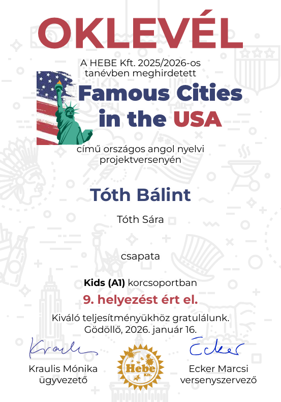Famous Cities in the USA Felkészítő tanáruk Barnáné Fekete Mónika tanárnő. Szívből gratulálunk! 2026.01.16